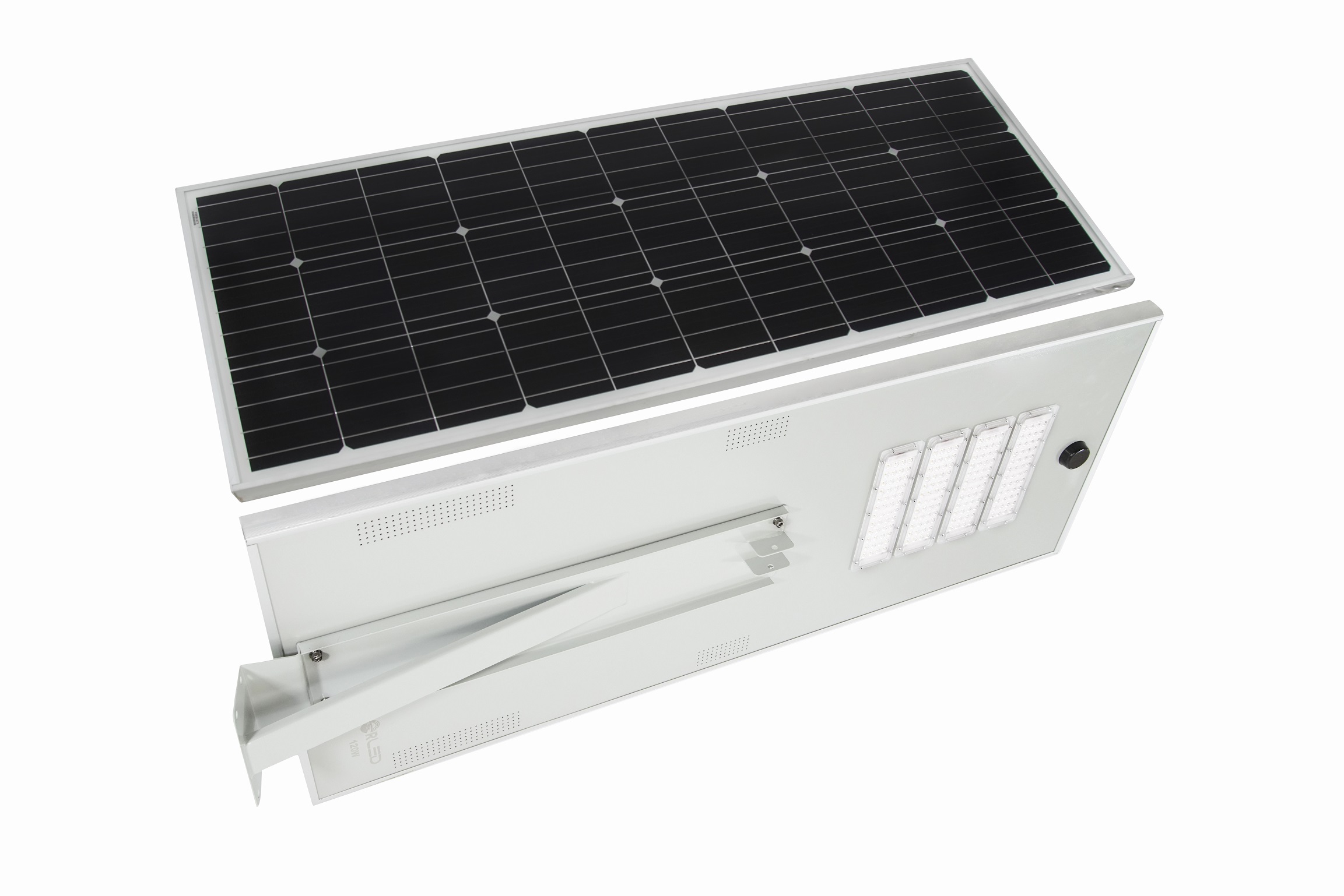 Luminaria autónoma solar “All in One”, incorpora sensor para mayor eficiencia y duración del sistema. La luminaria esta compuesta por LEDs de alto desempeño, batería de litio, panel de silicio monocristalino y regulador de carga PWM. El sistema tiene una configuración preestablecida para tener iluminación por un promedio de 10 horas, cuando detecta movimiento enciende al 100%, posteriormente se atenúa cuando no detecta presencia. Altura de montaje máxima recomendada: Potencias de 40, 60 y 80 watts hasta 9 metros; 100 y 120 watts hasta 12 metros.